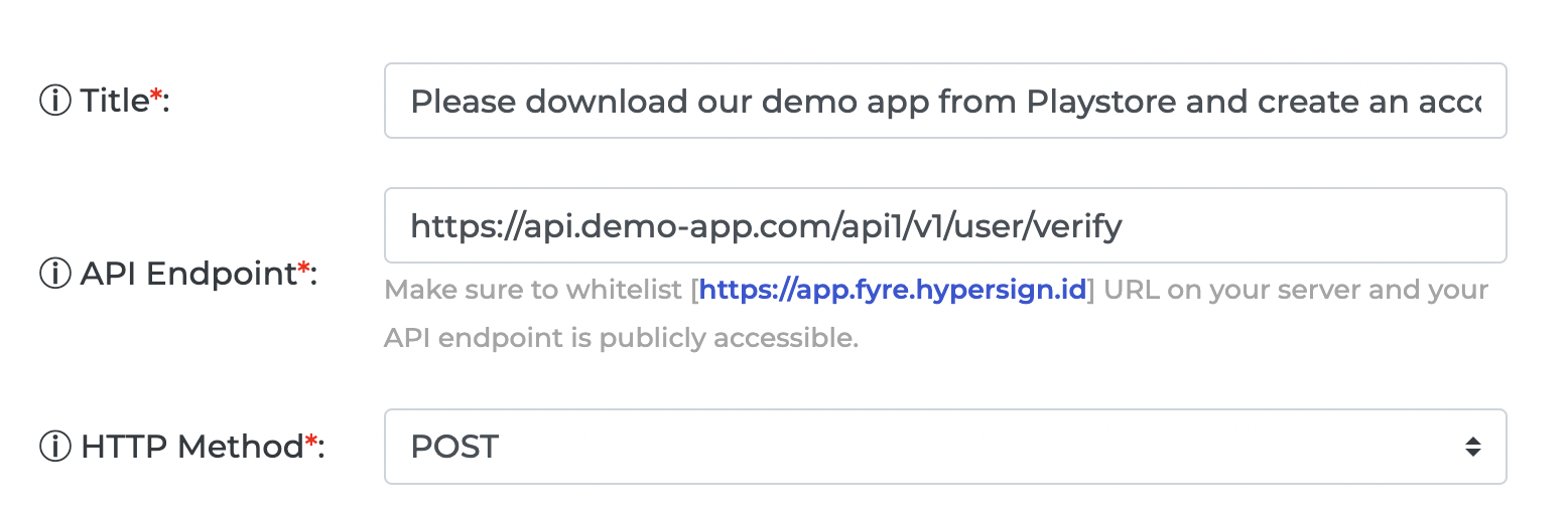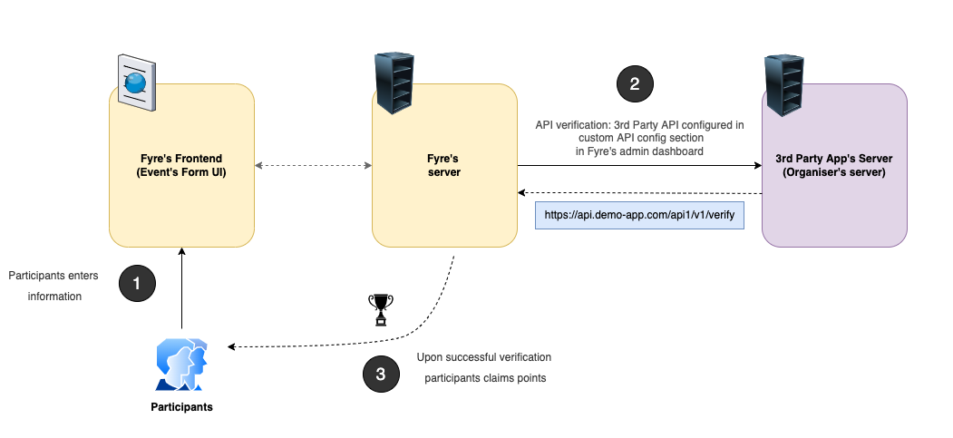 An organizer has to implement an API (GET or POST HTTP methods) for verifying certain data provided by participants in an event configured in Fyre. The API can then be configured under **"Custom API Configuration"** section.&#x20;