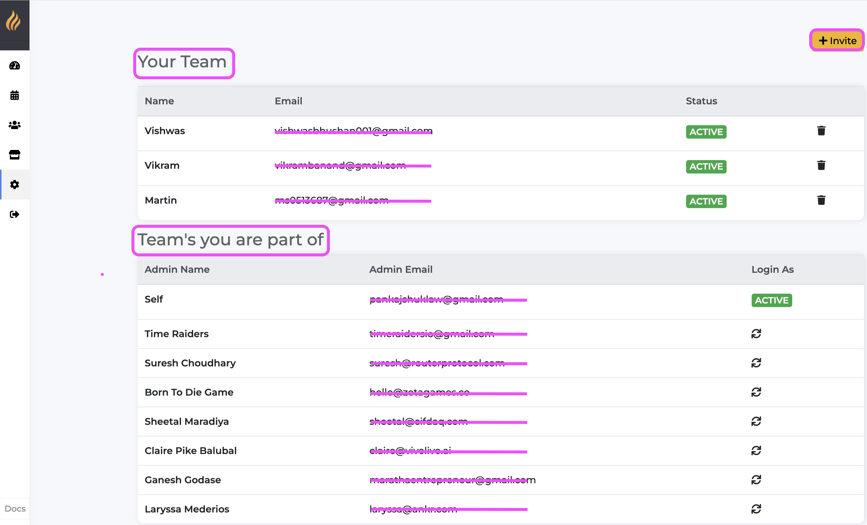 **Invite:** Add a new team member to your dashboard.&#x20;